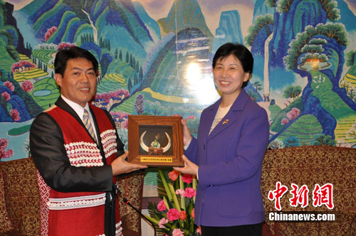 11日,臺灣少數民族長老頭目大陸訪問團一行40余人抵達陜西。圖為中共陜西省委副書記王俠(右)接受訪問團贈送的禮物。中新網發 冽瑋 攝