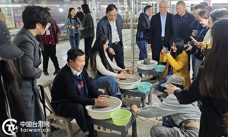 媒體記者們親手體驗汝瓷拉坯、修坯的過程。(中國臺灣網(wǎng)發(fā))