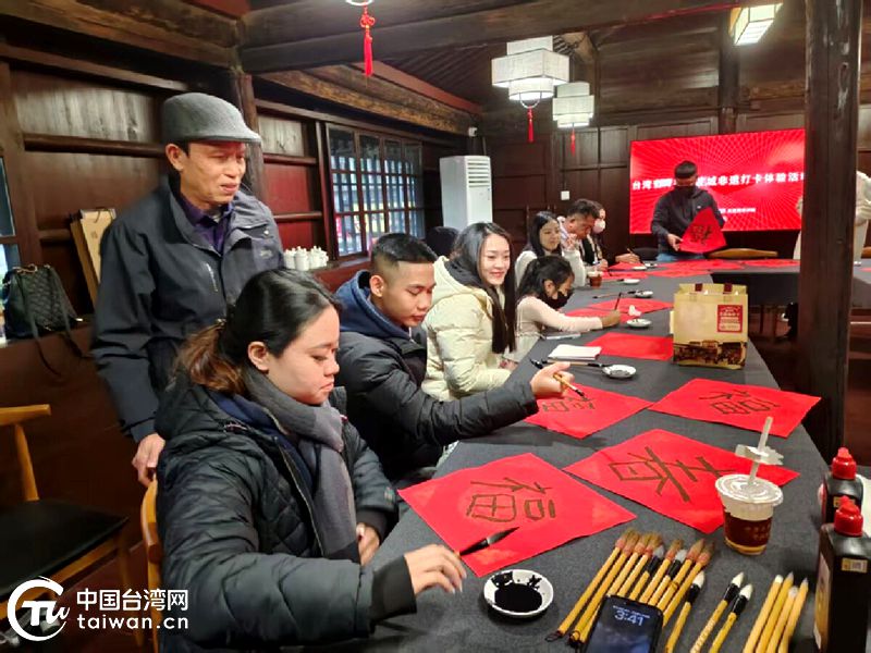 臺(tái)灣青年體驗(yàn)毛筆書法。(中國臺(tái)灣網(wǎng)發(fā))