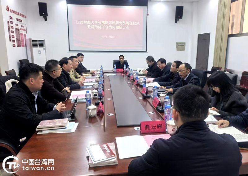 中國臺灣網(wǎng)1月4日訊 為進(jìn)一步提升江西省涉臺研究水平,在江西省臺辦的大力支持下,12月29日,江西財經(jīng)大學(xué)臺灣研究所研究員聘任儀式暨新形勢下臺灣問題研討會在南昌召開,現(xiàn)場為研究員頒發(fā)聘書,組織大家開展研討交流。江西省臺辦二級巡視員江雷,江西財經(jīng)大學(xué)黨委常委、副校長賀丹君出席。