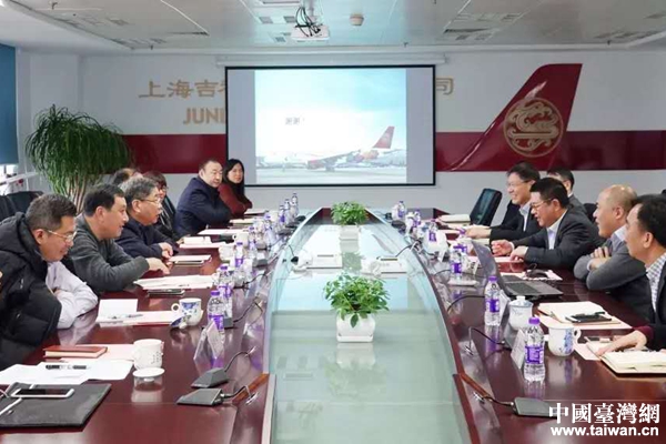 上海市臺辦主任李文輝、副主任王立新等一行走訪上海吉祥航空股份有限公司,并與吉祥航空董事長王均金、總裁趙宏亮等交流座談。(圖片來源:上海市臺辦)
