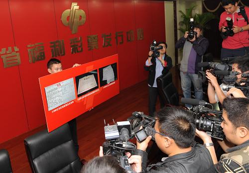 中國(guó)福彩3.599億元巨獎(jiǎng)得主現(xiàn)身兌獎(jiǎng) 新華社記者趙鵬攝