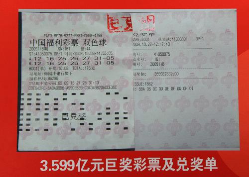 2009年10月8日晚,中國(guó)福利彩票雙色球第2009118期開(kāi)獎(jiǎng),當(dāng)期全國(guó)共中出一等獎(jiǎng)93注,每注獎(jiǎng)金409.07萬(wàn)元,其中河南省彩民一舉獲得88注一等獎(jiǎng),累計(jì)獲得獎(jiǎng)金3.599億元,創(chuàng)造了新中國(guó)彩票發(fā)行以來(lái)單張彩票獲頭獎(jiǎng)金額最高的新記錄。