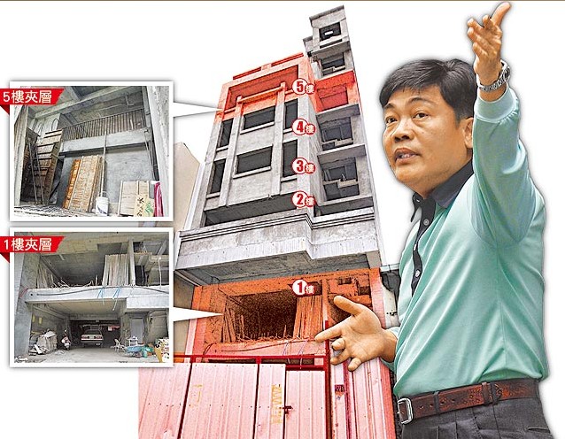 書(shū)記官楊金池與妻子申請(qǐng)興建5層獨(dú)立住宅,卻在1樓與5樓蓋非法夾層(白框處),讓5樓變7樓。(臺(tái)媒圖)