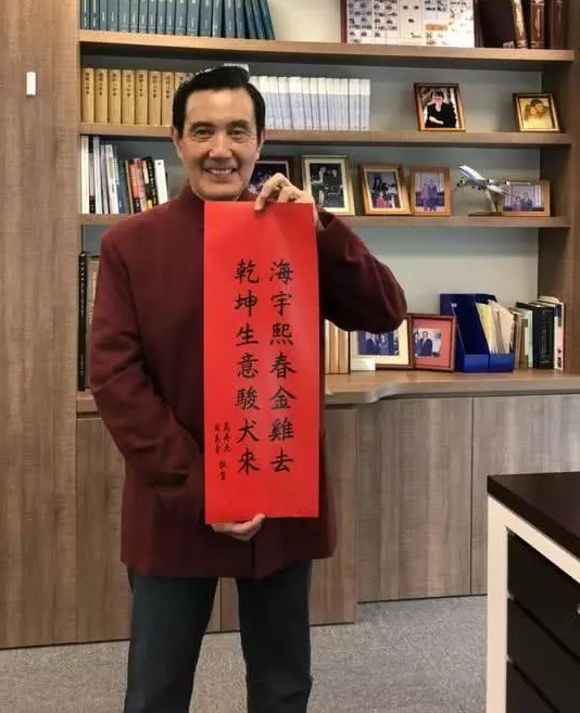 據報道,馬英九日前前往臺南市議員林燕祝服務處,現場揮毫,送出3幅“狗年旺旺 財源滾滾”春聯,當時就吸引不少民眾詢問,今年正式版的自制春聯“海宇熙春金雞去 乾坤生意駿犬來”一推出,10萬份一天就被搶光,目前共加印22萬份,在66處發放點重新“上架”,以供民眾免費索取。