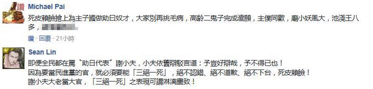當臺客身陷囹圄時,臺灣“駐日代表處”拿不出有效的辦法解決問題不說,連身為“駐日代表”的謝長廷,當下竟還在打“政治口水戰”的批評島內事務、檢討國民黨主席吳敦義,而針對民眾對其救援不力、毫無作為的指控更全盤否認,還抱怨稱其他地方的人民也未多做要求,并對罵他的網友喊話“罵要罵得具體”、“網絡影片罵我都罵三字經,有的我看年紀輕輕也不講理,罵我祖宗八代”。