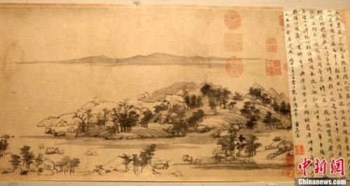 資料圖:2011年6月1日,深受兩岸矚目的“山水合璧——黃公望與富春山居圖特展”在臺北故宮博物館舉行。在本次合璧大典中,最受關注的就是《富春山居圖》前段“剩山圖”與后段“無用師卷”實現360年來的首次合璧。《富春山居圖》前段稱《剩山圖》,現藏浙江省博物館;后段較長稱《無用師卷》,現藏臺北故宮博物院。趙振清 攝