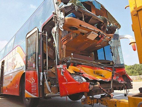 滿載福興宮志工的游覽車不慎追撞前車,車頭全毀。 臺灣《聯(lián)合報》記者邵心杰/攝影