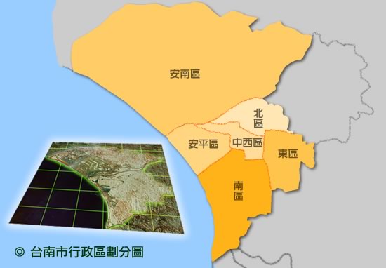 臺(tái)南原名赤崁,因高山族西拉雅平埔人赤崁社得名。昔有優(yōu)良大型海灣,灣外有沙洲屏護(hù),為大陸閩、粵漁民和澎湖漁民的天然避風(fēng)港和棲息地,并與當(dāng)?shù)馗呱阶逋M(jìn)行換貨貿(mào)易。明天啟初年,顏思齊從日本至臺(tái)灣,召閩南饑民入臺(tái)開墾,與當(dāng)?shù)孛褡褰煌媸ⅲ嵵埪什炕卮箨懞螅糠秩藛T留在當(dāng)?shù)爻蔀楦呱阶暹M(jìn)行貿(mào)易活動(dòng)的商人,俗稱“番割”。天啟三年(1623年)荷蘭東印度公司要求與明朝通商被拒絕后,從澎湖入侵此地,建普邏民遮堡作為經(jīng)濟(jì)掠奪的踞點(diǎn),并強(qiáng)迫居民設(shè)置“社商”,作為貿(mào)易機(jī)構(gòu)。1661年鄭成功收復(fù)臺(tái)灣后,改邏民遮堡為承天府,作為施政中心。清康熙二十二年(1683年)統(tǒng)一臺(tái)灣后,改承天府為臺(tái)灣府,仍為行政中心。由于人口日眾,市區(qū)擴(kuò)大,除保留鄭氏設(shè)置的四坊外,并增辟保西、永寧、永康、仁和、新昌、效忠等里。形成“商賈日盛,市街紛錯(cuò)”的繁榮景象。光緒十三年(1887年)臺(tái)灣建省,臺(tái)灣府北移葫蘆墩(今臺(tái)中市),原臺(tái)灣府改名為臺(tái)南府,此為臺(tái)南地名的由來。光緒二十一年(1895年)日本侵占后,初仿清制,設(shè)臺(tái)南縣,后改臺(tái)南廳,1920年設(shè)臺(tái)南市。1945年光復(fù)后,仍設(shè)臺(tái)南市。