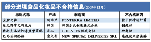 昨日,國家質檢總局發布最新一批進境不合格食品、化妝品信息(2009年12月)顯示,141批次洋食品和化妝品被處退貨或銷毀處理。這次公布的名單顯示,部分進口乳制品被指不合格。