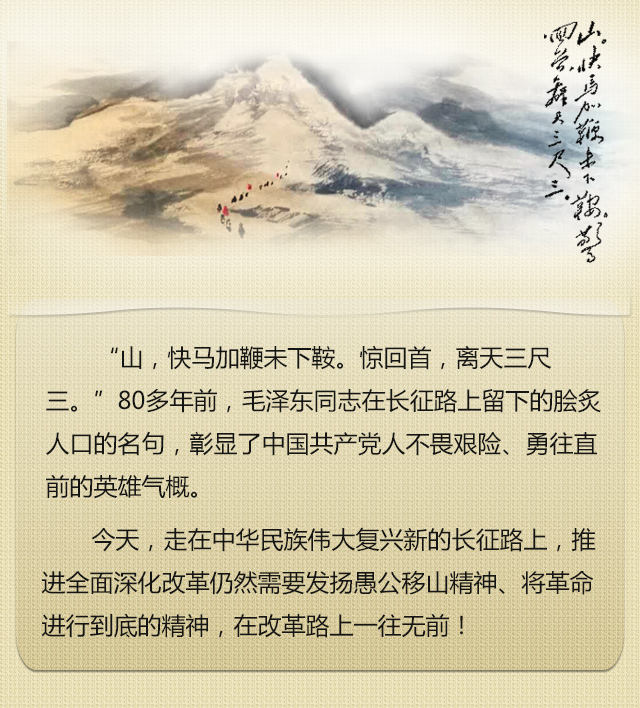 今天,走在中華民族偉大復(fù)興新的長征路上,推進(jìn)全面深化改革仍然需要發(fā)揚(yáng)愚公移山精神、將革命進(jìn)行到底的精神,在改革路上一往無前!