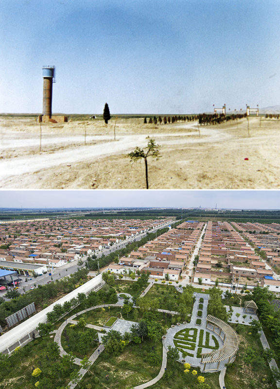 拼版照片:上圖為寧夏永寧縣閩寧鎮(zhèn)建設(shè)初期的鄉(xiāng)鎮(zhèn)雛形(資料照片);下圖為俯瞰寧夏永寧縣閩寧鎮(zhèn)原隆移民村(2016年7月22日攝)。新華社記者 王鵬 攝