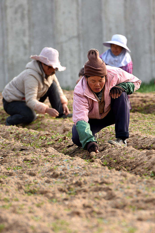 2016年3月23日,在河南省鹿邑縣楊湖口鎮(zhèn)小廟村,農(nóng)戶為蔬菜間苗。新華社記者李博 攝