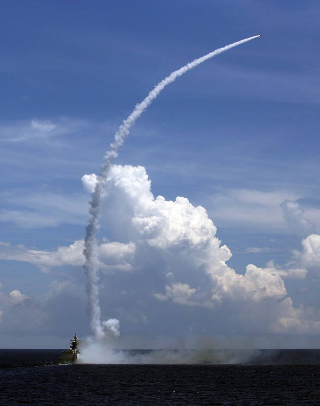 海軍在海南島至西沙附近海空域組織的實(shí)兵實(shí)彈對抗演練中,導(dǎo)彈護(hù)衛(wèi)艦發(fā)射防空導(dǎo)彈(2016年7月8日攝)。新華社記者 查春明 攝