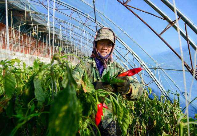 1月25日,“貧困戶”潘素琴在溫室大棚里勞作。新華社記者 連振 攝