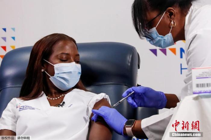 當地時間2021年1月4日,美國紐約,護士桑德拉·林賽在長島猶太醫院接種新冠病毒疫苗第二針。