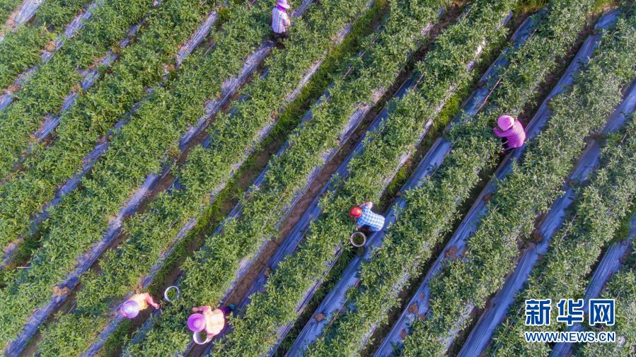 2月28日,在海南省瓊海市塔洋鎮(zhèn)一處瓜菜種植基地,農(nóng)民在采摘辣椒,準(zhǔn)備銷往國(guó)內(nèi)各大批發(fā)市場(chǎng)(無(wú)人機(jī)照片)。