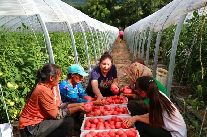 十三屆全國人大代表、內(nèi)蒙古自治區(qū)赤峰市小廟子村黨總支書記趙會杰(中)在蔬菜大棚了解西紅柿的生長情況。(資料照片)