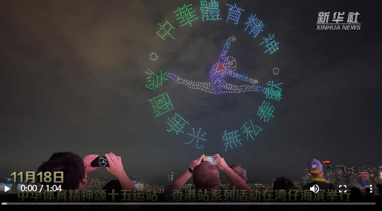 11月18日,“中華體育精神頌十五運站”香港站系列活動在灣仔海濱舉行。1200架無人機在維多利亞港璀璨夜空勾勒出一幅幅震撼人心的畫面:本屆全運會吉祥物“喜洋洋”和“樂融融”身姿靈動。擊劍凌空、飛人扣籃、箭射十環、賽場接力等依次閃現,與全運會賽場上的競技場景遙相呼應;港珠澳大橋化作賽道,粵港澳三地標志性建筑依次浮現,展現大灣區共辦全運的協同力量。