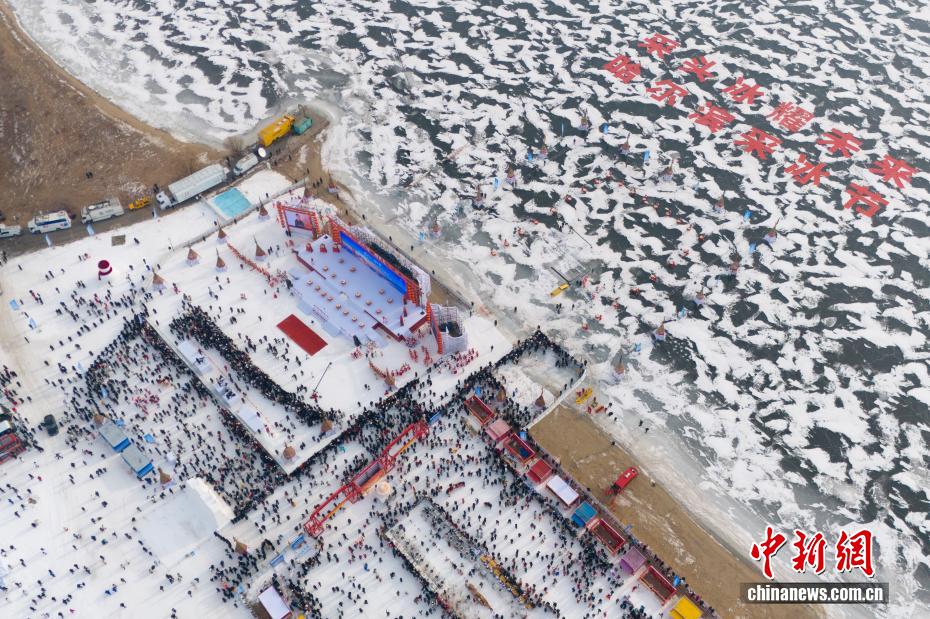12月7日,第六屆哈爾濱采冰節(jié)在松花江北岸沙灘部落啟幕。在活動當天,采冰人身著傳統(tǒng)服飾,在封凍的松花江上取晶瑩剔透的“頭冰”。此外,在活動現場,游客還可以在冰雪大集市上,品嘗江水燉江魚、大鍋煮餃子等特色美食。從此日開始,松花江所采的冰將被送往冰雪大世界,構筑起新一年的冰雪王國。圖為活動現場。(無人機照片)