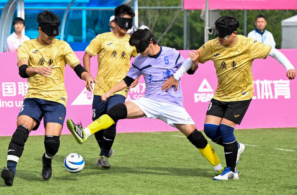 12月14日,在廣州舉行的全國第十二屆殘疾人運動會暨第九屆特殊奧林匹克運動會盲人足球項目男子組小組賽中,天津隊1:0戰勝廣東二團隊。圖為天津隊球員范海林(右二)在比賽中突破。新華社記者 陳浩明 攝