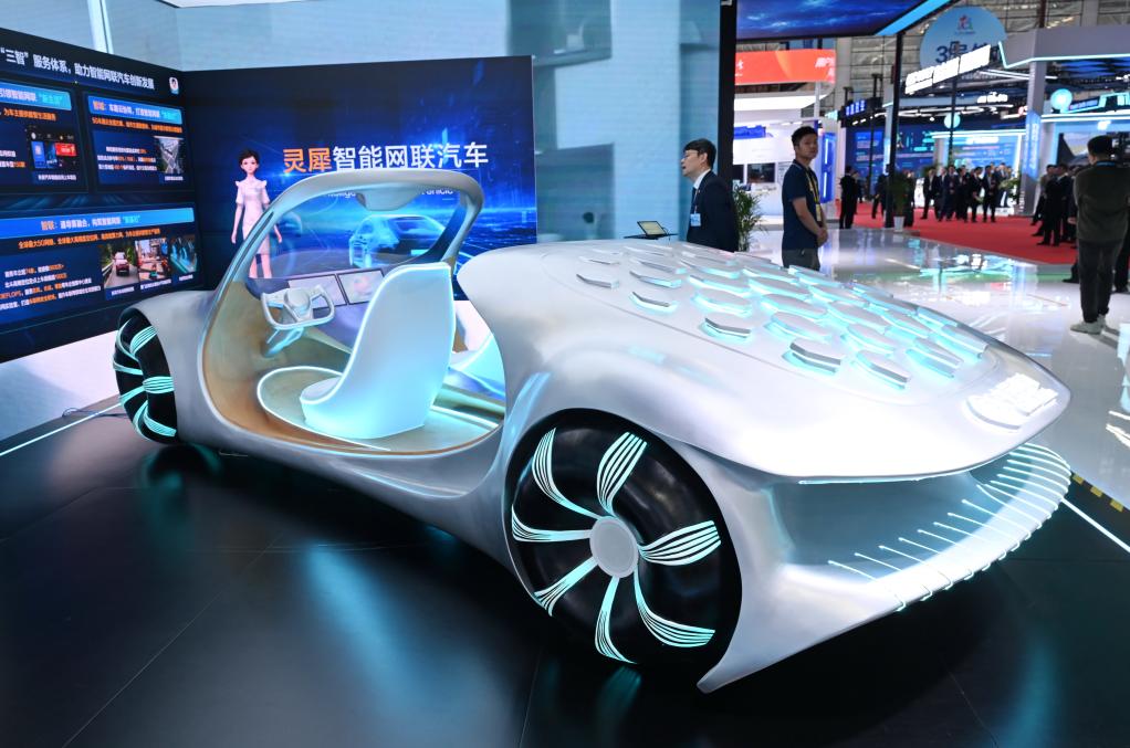 2025年4月29日,在第八屆數字中國建設峰會現場體驗區拍攝的靈犀智能網聯汽車。新華社記者 林善傳 攝