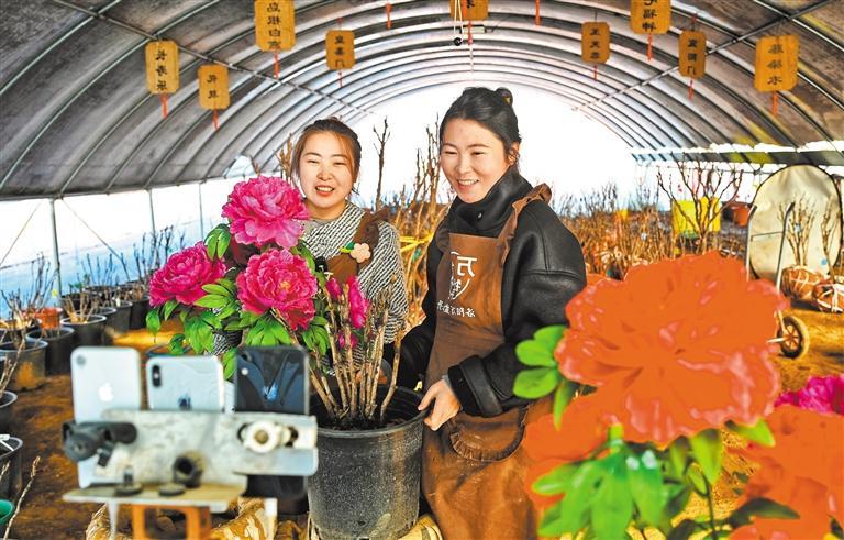 12月15日,河南省洛陽市土橋社區溫室大棚,花農通過網絡平臺直播銷售催花牡丹。