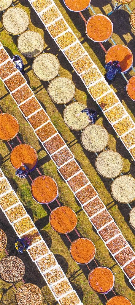 11月27日,江西省宜春市銅鼓縣溫泉鎮祿田村銅鄉匯鄉村特產手工坊,村民在晾曬紅薯、南瓜、生姜等農作物。該縣不斷延長土特產產業鏈,助農增收。