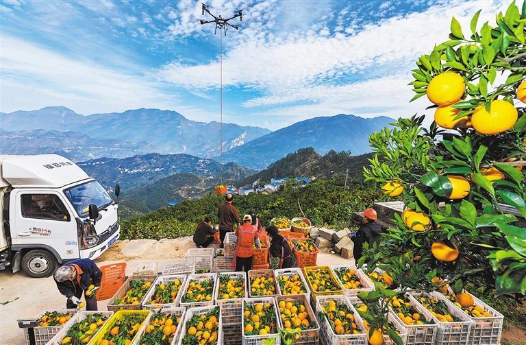 11月26日,湖北省宜昌市秭歸縣郭家壩鎮鄧家坡村,無人機飛手操作無人機吊運鮮橙。該縣推動“電商+供應鏈+農戶”發展模式,拓寬臍橙銷售路徑。