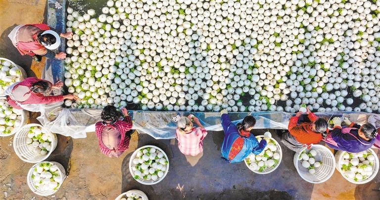 11月24日拍攝的重慶市墊江縣新民鎮七橋村蔬菜園,村民在清洗白蘿卜。該蔬菜園結合大棚控溫、滴灌、無土培育和智能監管等技術,日均可供應新鮮蔬菜達5000斤。