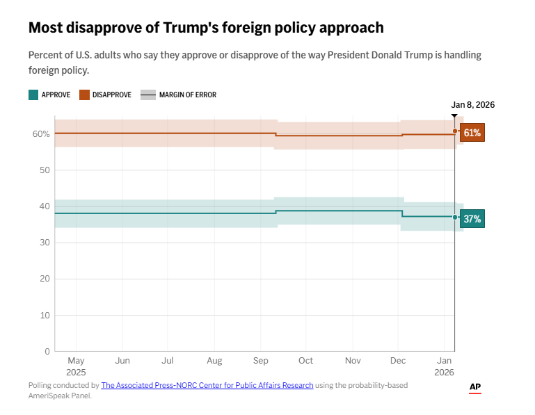 美聯社近日刊文稱,美聯社-NORC公共事務研究中心最新民意調查顯示,56%的美國成年人認為,美國政府在動用軍隊干預他國的問題上“太過火”,同時多數人對美國政府的整體外交政策及在委內瑞拉問題上的處理方式持否定態度。