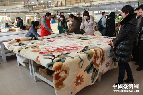 記者們對(duì)維信公司高檔精美的毛毯制品贊不絕口。(中國臺(tái)灣網(wǎng) 王怡然 攝)