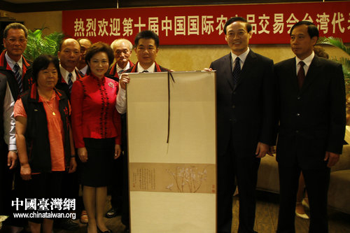 農業部副部長余欣榮向第十屆農交會臺灣代表團贈送傳統卷軸畫作。(中國臺灣網 郭瑩瑩 攝)