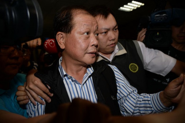 劉政池(中)由臺(tái)北市調(diào)處移送士林地檢署復(fù)訊。(臺(tái)媒圖)