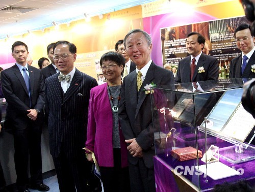 2月5日,香港中文大學舉辦的“高錕成就展”開幕,展品包括諾貝爾物理學獎得主、中大前校長高錕贈送的他歷年獲得的18個獎狀、獎牌。圖為特區行政長官曾蔭權與高錕夫婦在物理學諾獎獎牌和證書前留影。 中新社發 洪少葵 攝