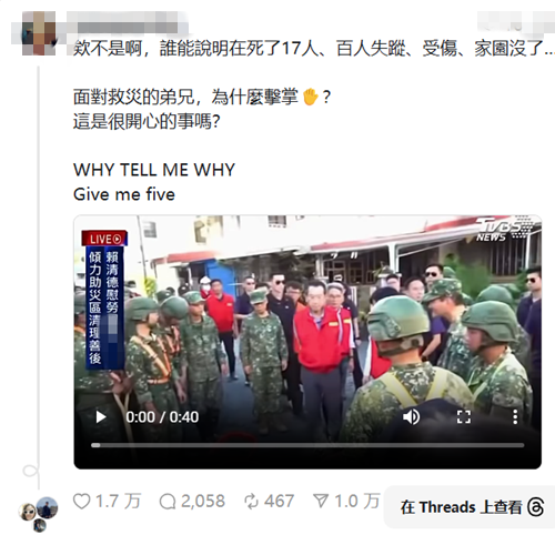 有網友在社交媒體上傳相關視頻表示,“欸不是啊,誰能說明在死了17人、百人失蹤、受傷、家園沒了,面對救災的弟兄,為什么擊掌?這是很開心的事嗎?”