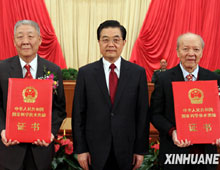 胡錦濤為谷超豪院士、孫家棟院士頒發獎勵證書