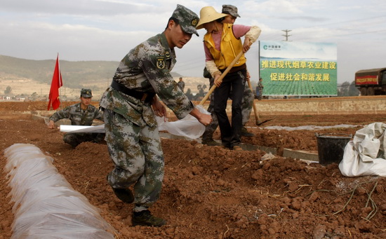 有效降水依舊未至,嚴重旱情仍在持續,云南省楚雄彝族自治州楚雄市子午鎮萬畝農田受到嚴重影響。春耕在即,成都軍區某高炮團緊急派出300多名官兵抗旱助農,贏得了當地政府和人民群眾的贊譽。
