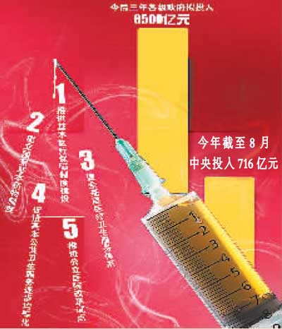 今年截至8月,中央財政已投入醫改716億元,基本醫保覆蓋面持續擴大,國家基本藥物制度啟動,基層醫療衛生服務體系不斷健全,公共衛生服務項目全面實施,公立醫院改革試點抓緊籌備。