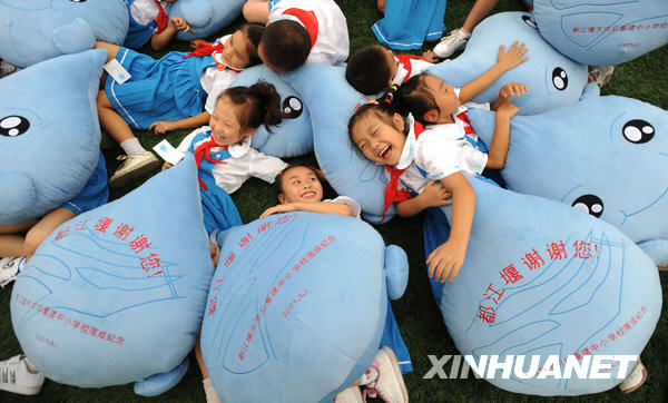 9月1日,在都江堰市北街小學(xué)新校區(qū),小學(xué)生們手抱校方制作的代表感激的“水滴娃娃”。 新華社記者 江宏景 攝