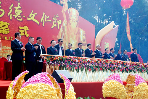 湖里區(qū)委書記李棟梁、福建省海峽文化研究會會長楊華基、臺灣寺廟金蘭會會長王增榮、新加坡道家總會會長陳添來、廈門市政協(xié)副主席陳昌生先后在開幕式上致辭。海峽兩岸關(guān)系協(xié)會副會長張銘清宣布第三屆福德文化節(jié)開幕并邀請在場嘉賓共同推動啟動桿啟動開幕。現(xiàn)場的嘉賓為福德文化墻和海峽兩岸非物質(zhì)文化遺產(chǎn)(仙岳山)展示中心項目奠基儀式培土。